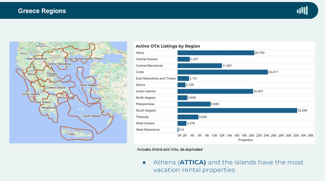 Η Οία της Σαντορίνης είναι η αγορά με το μεγαλύτερο μερίδιο βραχυπρόθεσμων ενοικιάσεων με επαγγελματική διαχείριση, ακολουθούμενη από τη Μύκονο. Η Αθήνα έχει επίσης αξιόλογο μερίδιο καταλυμάτων τα οποία διαχειρίζονται εταιρείες και όχι μεμονωμένοι ιδιώτες.