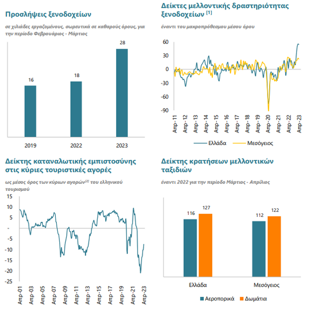 Τα ιδιαίτερα αισιόδοξα στοιχεία για τον ξενοδοχειακό κλάδο, δημοσιεύει σε μελέτη της η Διεύθυνση Οικονομικής ανάλυσης της Εθνικής Τράπεζας (ΕΤΕ), τα οποία δείχνουν ότι το δυναμικό ξεκίνημα της φετινής τουριστικής χρονιάς θα συνεχιστεί και για το υπόλοιπο του έτους. Βασικό εύρημα της ανάλυσης είναι ότι τα ελληνικά ξενοδοχεία επιβεβαιώνουν το θετικό κλίμα, διατηρώντας προσδοκίες για αναπτυξιακή υπεροχή τόσο για το 2023 όσο και για την επόμενη τριετία. Οι ευνοϊκοί για την Ελλάδα πρόδρομοι δείκτες τουριστικής δραστηριότητας στο κρίσιμο διάστημα Μαρτίου-Απριλίου όπως οι κρατήσεις πτήσεων (+16% έναντι του 2022 και 12% υψηλότερα των ανταγωνιστών) και οι κρατήσεις ξενοδοχείων (+27% έναντι του 2022 και 22% υψηλότερα των ανταγωνιστών), ενισχύουν το κλίμα. Όπως επισημαίνεται, στις αισιόδοξες εκτιμήσεις συμβάλλουν οι βελτιωμένες προσδοκίες ζήτησης, όπως αντικατοπτρίζονται στο δείκτη καταναλωτικής εμπιστοσύνης στις βασικές αγορές, όπου μετά από αλλεπάλληλες κρίσεις (πανδημία, γεωπολιτικές και ενεργειακή κρίση), εμφανίζουν τάση σταδιακής ανάκαμψης.