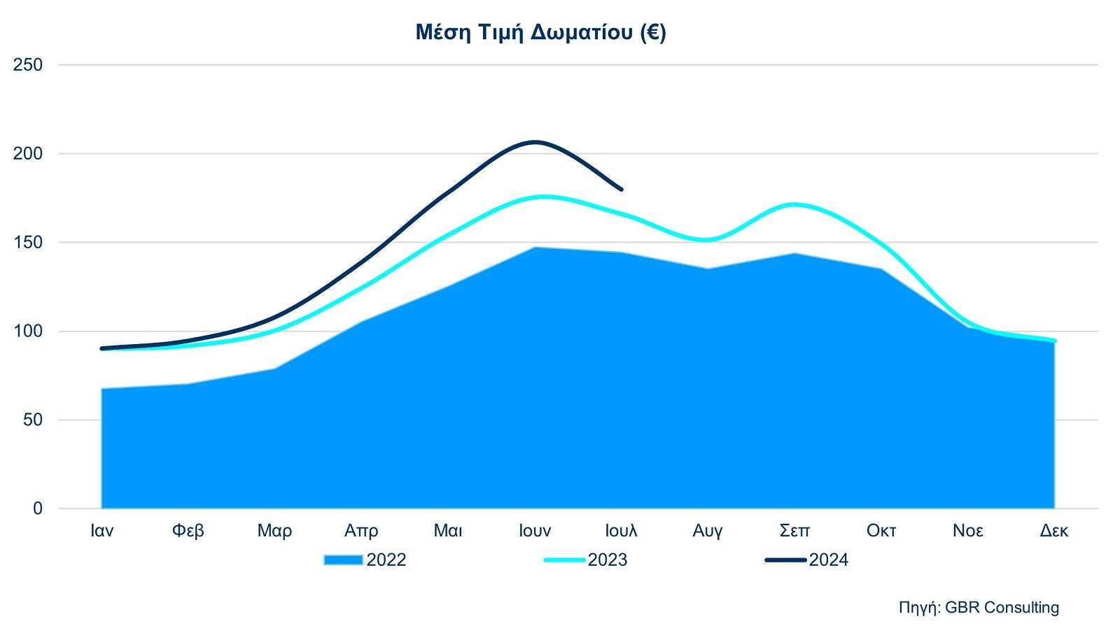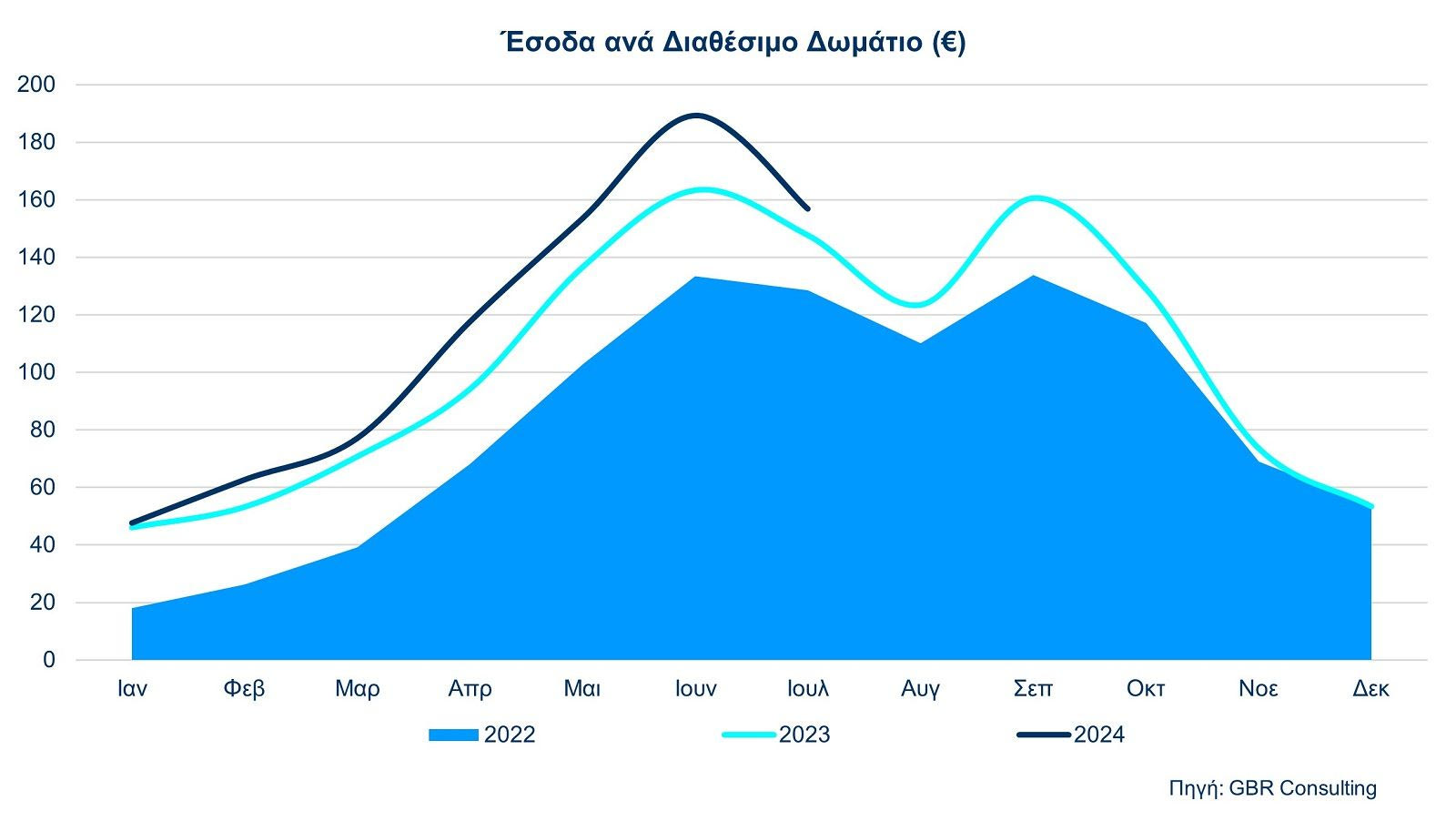 Αντίστοιχα, το 7μηνο του 2024, η μέση τιμή δωματίου (ADR) αγγίζει τα 149,09 ευρώ, αυξημένη κατά 9,9% σε σύγκριση με το 7μηνο του 2023, ενώ το RevPar σημειώνει αύξηση 12,7%, φτάνοντας τα 115,07 ευρώ.