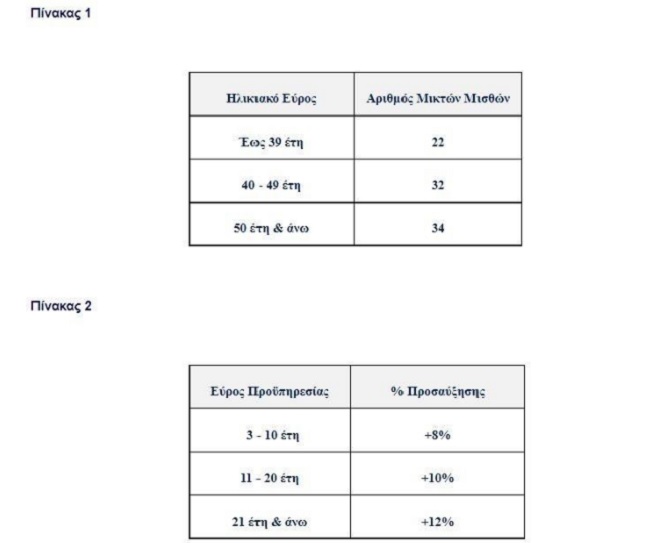 Στους Πίνακες 1 και 2, που ακολουθούν, εμφανίζεται ο αριθμός των μικτών μισθών (με βάση υπολογισμού το μικτό μηνιαίο μισθό Μαΐου 2021), που δικαιούται να λάβει ο εργαζόμενος σύμφωνα με το εύρος ηλικίας (με βάση υπολογισμού τα συμπληρωμένα έτη κατά την 31η Δεκεμβρίου 2021) και το αντίστοιχο ποσοστό προσαύξησης ανά εύρος προϋπηρεσίας στον Όμιλο (με βάση υπολογισμού τα συμπληρωμένα έτη προϋπηρεσίας κατά την 31η Δεκεμβρίου 2021).