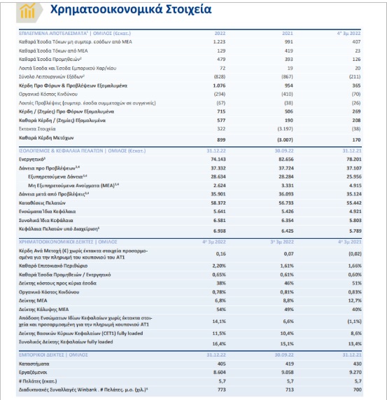 Η ενισχυμένη οργανική παραγωγή κεφαλαίου οδήγησε τον δείκτη CET1 fully loaded στο 11,5%, αυξημένο κατά περίπου 110 μονάδες βάσης σε τριμηνιαία βάση και κατά περίπου 300 μονάδες βάσης τους τελευταίους 12 μήνες. Το χαρτοφυλάκιο εξυπηρετούμενων δανείων του Ομίλου αυξήθηκε κατά €2,7 δισ. το 2022, με καθαρή πιστωτική επέκταση €550 εκατ. στο 4ο τρίμηνο.
