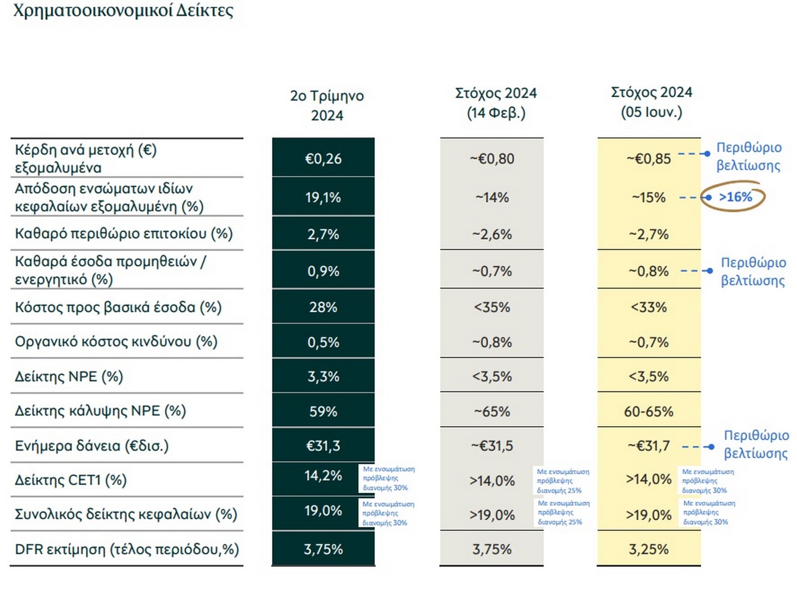 Μετά τα αποτελέσματα εξαμήνου, η τράπεζα αναθεωρεί τον στόχο για την απόδοση ενσώματων ιδίων κεφαλαίων (εξομαλυμένη) στο 16% από 15% προηγουμένως και σε ό,τι αφορά τα καθαρά έσοδα προμηθειών προς ενεργητικό στο 0,8% από 0,7% προηγουμένως. Εκτιμά δε ότι τα ενήμερα δάνεια θα φτάσουν τα 31,7 δισ. ευρώ από 31,5 δισ. ευρώ προηγουμένως.