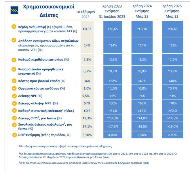 Με βάση τις ισχυρές επιδόσεις του 1ου εξάμηνου 2023 και το εξελισσόμενο περιβάλλον επιτοκίων, αναβαθμίζουμε τους βασικούς χρηματοοικονομικούς μας στόχους για το έτος 2023, στοχεύοντας πλέον σε απόδοση ενσώματων ιδίων κεφαλαίων περίπου 14%, με δείκτη κόστους προς βασικά έσοδα κάτω του 38%. Ο δείκτης ΝΡΕ αναμένεται να διαμορφωθεί κάτω από το επίπεδο ορόσημο του 5% στο τέλος του έτους 2023.