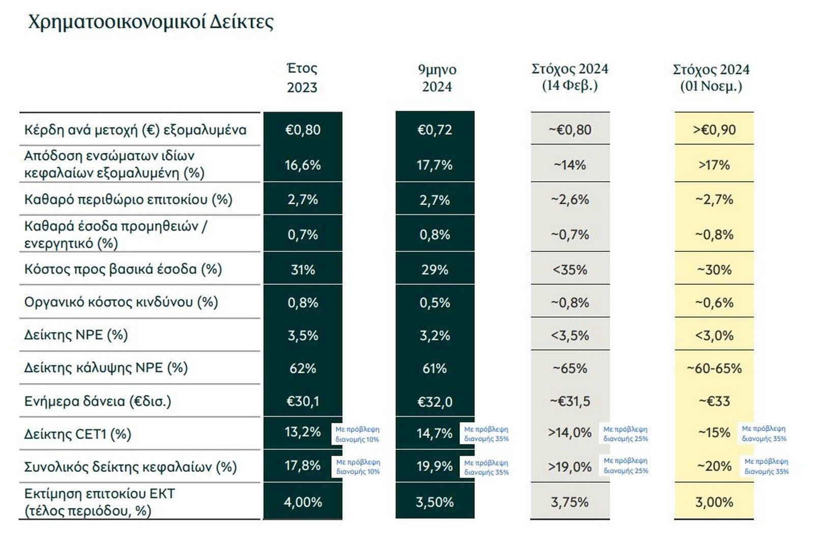Βασιζόμενη στις επιδόσεις του 2024 και τη μέχρι τώρα δυναμική, η Πειραιώς αναβαθμίζει σήμερα τους στόχους της για το 2024. Τα βασικά σημεία περιλαμβάνουν ενίσχυση κερδοφορίας, με εξομαλυμένη απόδοση ενσώματων ιδίων κεφαλαίων άνω του 17%, εξομαλυμένα κέρδη ανά μετοχή πλέον των €0,90, περαιτέρω αύξηση του δείκτη CET1 σε περίπου 15%, άνοδο των ενήμερων δανείων στα €33 δισ. και δείκτη μη εξυπηρετούμενων ανοιγμάτων χαμηλότερα του 3%. Επίσης, στοχεύουμε πλέον σε ποσοστό διανομής κερδών 35% από τα κέρδη του 2024, υπό την αίρεση εκπλήρωσης των απαραίτητων προϋποθέσεων, ενώ το ποσοστό διανομής 50% για το επόμενο έτος έχει επικυρωθεί στην επικαιροποιημένη πολιτική διανομής.