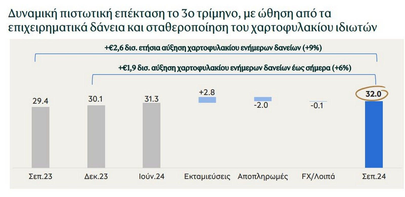 Η Τρ. Πειραιώς πέτυχε αύξηση χαρτοφυλακίου εξυπηρετούμενων δανείων κατά €1,9 δισ. στο εννεάμηνο, στα €32 δισ., οδηγώντας σε επικαιροποίηση στόχου για €33 δισ. στο τέλος του 2024, το οποίο αντιστοιχεί σε αύξηση 10%. Από τα €2,8 δισ. εκταμιεύσεων στο 3ο τρίμηνο, περίπου €1,3 δισ. διοχετεύθηκαν σε μικρές, μεσαίες επιχειρήσεις και ιδιώτες, και περίπου €1,3 δισ. σε μεγάλες επιχειρήσεις. Η περίμετρος των δανείων Πειραιώς συνδεδεμένων με το Ταμείο Ανάκαμψης και Ανθεκτικότητας διαμορφώνεται σε €1,5 δισ., επιπλέον των €0,5 δισ. που έχουν ήδη εκταμιευθεί.