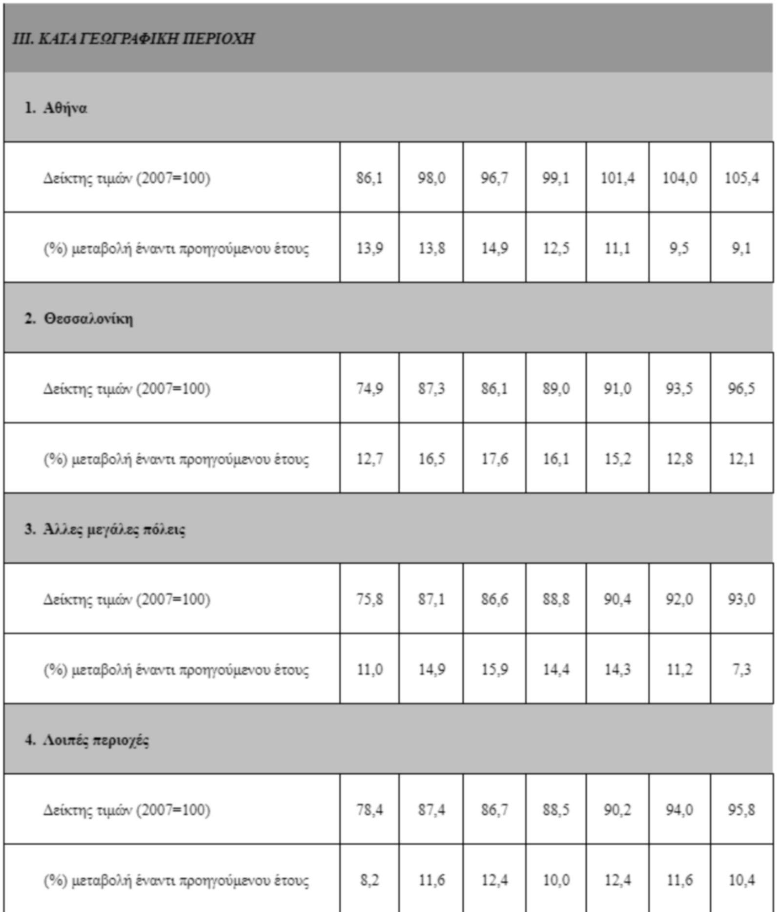 Από την ανάλυση των στοιχείων κατά γεωγραφική περιοχή προκύπτει ότι η αύξηση των τιμών των διαμερισμάτων το β΄ τρίμηνο του 2024 σε σχέση με το αντίστοιχο τρίμηνο του 2023 ήταν 9,1% στην Αθήνα, 12,1% στη Θεσσαλονίκη, 7,3% στις άλλες μεγάλες πόλεις και 10,4% στις λοιπές περιοχές της χώρας. Για το σύνολο του 2023, η αύξηση των τιμών στις ίδιες περιοχές σε σχέση με το 2022 ήταν 13,8%, 16,5%, 14,9% και 11,6% αντίστοιχα (αναθεωρημένα στοιχεία). Τέλος, για το σύνολο των αστικών περιοχών της χώρας, το β΄ τρίμηνο του 2024 οι τιμές των διαμερισμάτων ήταν κατά μέσο όρο αυξημένες κατά 9,0% σε σύγκριση με το β΄ τρίμηνο του 2023, ενώ για το 2023 η μέση ετήσια αύξηση διαμορφώθηκε στο 14,2% (αναθεωρημένα στοιχεία).