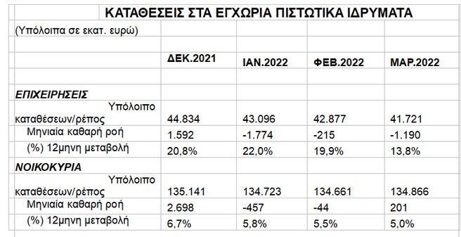Συγκεκριμένα, τα νοικοκυριά «σήκωσαν» από τις καταθέσεις του 3,113 δις ευρώ (από 44,834 στο τέλος Δεκεμβρίου 2021 οι καταθέσεις τους μειωθήκαν σε 41,721 δις ευρώ στο τέλος του περασμένου Μαρτίου) ενώ οι επιχειρήσεις «τράβηξαν» 255 εκατ ευρω (από 135,141 δις ευρώ οι καταθέσεις τους μειώθηκαν σε 134,885 δις ευρώ).