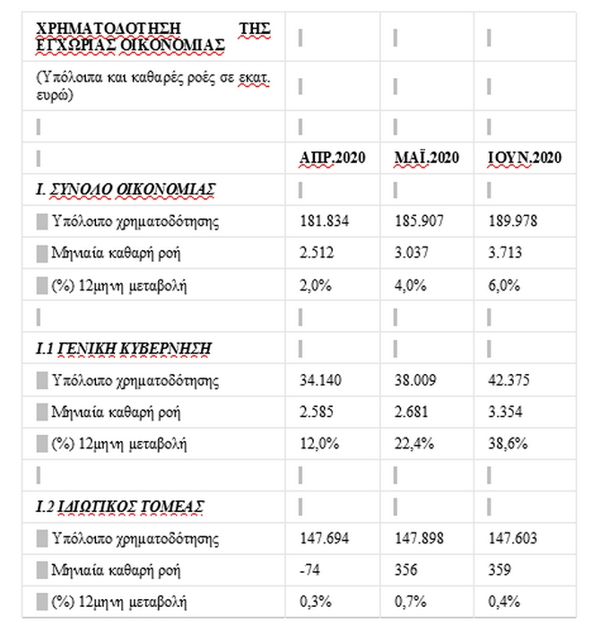 Η μηνιαία καθαρή ροή της χρηματοδότησης προς τη γενική κυβέρνηση, τον Ιούνιο του 2020, ήταν θετική κατά 3.354 εκατ. ευρώ, έναντι θετικής καθαρής ροής 2.681 εκατ. ευρώ τον προηγούμενο μήνα. Ο ετήσιος ρυθμός μεταβολής της χρηματοδότησης της γενικής κυβέρνησης αυξήθηκε σε 38,6% από 22,4% τον προηγούμενο μήνα. Αντίστοιχα, για τη χρηματοδότηση του ιδιωτικού τομέα αναφέρεται ότι: Τον Ιούνιο του 2020, o ετήσιος ρυθμός μεταβολής της συνολικής χρηματοδότησης του ιδιωτικού τομέα μειώθηκε σε 0,4% από 0,7% τον προηγούμενο μήνα. Η μηνιαία καθαρή ροή της συνολικής χρηματοδότησης προς τον ιδιωτικό τομέα ήταν θετική κατά 359 εκατ. ευρώ, έναντι θετικής καθαρής ροής 356 εκατ. ευρώ τον προηγούμενο μήνα.