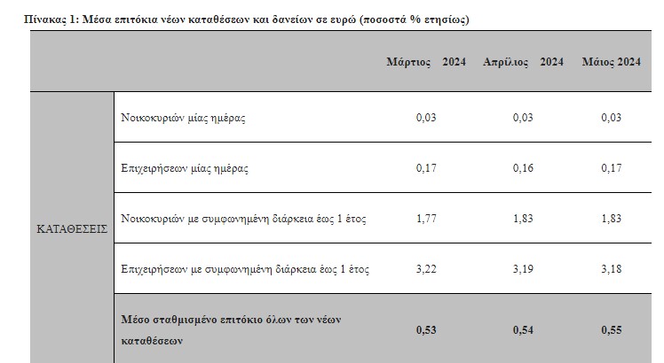 - Το Μάιο του 2024, το μέσο σταθμισμένο επιτόκιο των νέων καταθέσεων παρέμεινε σχεδόν αμετάβλητο στο 0,55%, ενώ το αντίστοιχο επιτόκιο των νέων δανείων μειώθηκε στο 5,54%.