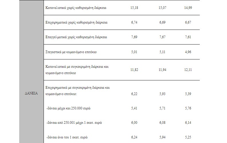 Το μέσο επιτόκιο των καταναλωτικών δανείων με συγκεκριμένη διάρκεια και κυμαινόμενο επιτόκιο αυξήθηκε κατά 17 μονάδες βάσης και διαμορφώθηκε στο 12,11%, ενώ το μέσο επιτόκιο των στεγαστικών δανείων με κυμαινόμενο επιτόκιο μειώθηκε κατά 15 μονάδες βάσης και διαμορφώθηκε στο 4,96%.