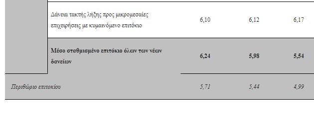 Το μέσο επιτόκιο των νέων επιχειρηματικών δανείων με συγκεκριμένη διάρκεια και κυμαινόμενο επιτόκιο μειώθηκε κατά 54 μονάδες βάσης και διαμορφώθηκε στο 5,39%. Το μέσο επιτόκιο των δανείων τακτής λήξης με κυμαινόμενο επιτόκιο προς μικρομεσαίες επιχειρήσεις (ΜΜΕ) αυξήθηκε κατά 5 μονάδες βάσης και διαμορφώθηκε στο 6,17%.