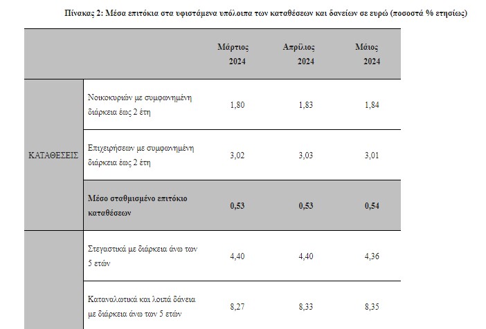 - Το Μάιο του 2024, το μέσο σταθμισμένο επιτόκιο του συνόλου των υφιστάμενων καταθέσεων παρέμεινε σχεδόν αμετάβλητο στο 0,54%, ενώ το αντίστοιχο επιτόκιο των δανείων μειώθηκε στο 6,23%.