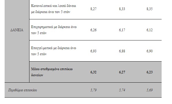 Ειδικότερα, το μέσο επιτόκιο στα υφιστάμενα υπόλοιπα των στεγαστικών δανείων με διάρκεια άνω των 5 ετών μειώθηκε κατά 4 μονάδες βάσης και διαμορφώθηκε στο 4,36%. Το αντίστοιχο επιτόκιο των καταναλωτικών και λοιπών δανείων προς ιδιώτες και ιδιωτικά μη κερδοσκοπικά ιδρύματα παρέμεινε σχεδόν αμετάβλητο στο 8,35%.