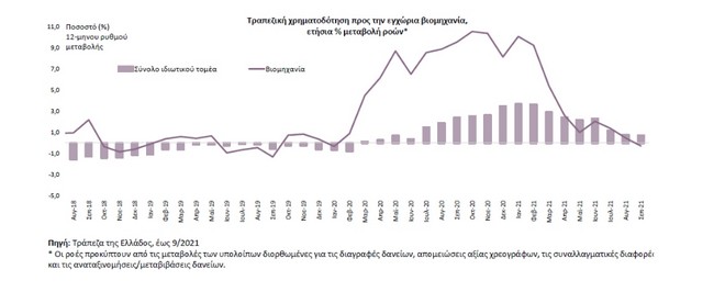 Σύμφωνα μάλιστα με το ΙΟΒΕ, ο 12μηνος ρυθμός ετήσιας αύξησης των πιστώσεων προς τη βιομηχανία έγινε αρνητικός τον Σεπτέμβριο για πρώτη φορά μετά από 18 μήνες. Στο σύνολο του ιδιωτικού τομέα (περιλαμβάνονται και τα νοικοκυριά), οι καθαρές ροές νέων πιστώσεων ήταν θετικές κατά 500 εκατ. ευρώ.