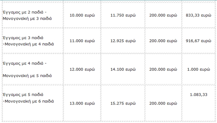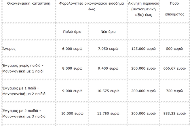 Δηλαδή το βασικό ποσό του βοηθήματος των 500 ευρώ προσαυξάνεται κατά 166,7 ευρώ για κάθε ενήλικο μέλος του νοικοκυριού και κατά 83,3 ευρώ για κάθε εξαρτώμενο τέκνο. Στον πίνακα που ακολουθεί φαίνεται αναλυτικά ποιο είναι το ποσό του επιδόματος που αναλογεί στους δικαιούχους ανά περίπτωση με βάση το φορολογητέο οικογενειακό εισόδημα και την αντικειμενική αξία από την ακίνητη περιουσία.