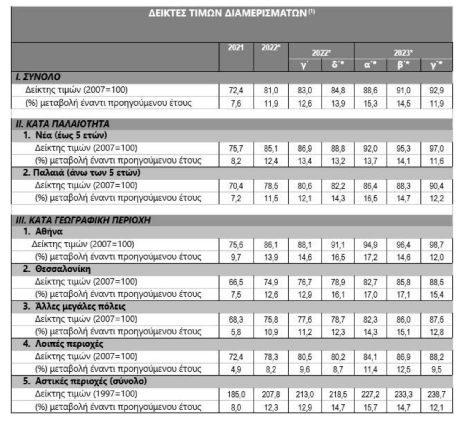 Τέλος, για το σύνολο των αστικών περιοχών της χώρας, το γ’ τρίμηνο του 2023 οι τιμές των διαμερισμάτων ήταν κατά μέσο όρο αυξημένες κατά 12,1% σε σχέση με το γ’ τρίμηνο του 2022, ενώ για το 2022 η μέση ετήσια αύξηση διαμορφώθηκε στο 12,3% (αναθεωρημένα στοιχεία).