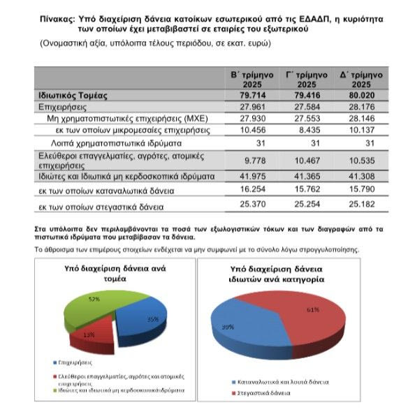 Υψηλότερη κατά 604 εκατ. ευρώ το δ΄ τρίμηνο του 2025, η ονομαστική αξία των δανείων του ιδιωτικού τομέα τα οποία διαχειρίζονται οι εγχώριες ΕΔΑΔΠ. Η συνολική κατανομή.