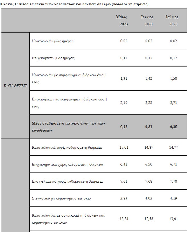 Το μέσο επιτόκιο των καταθέσεων με συμφωνημένη διάρκεια έως 1 έτος από νοικοκυριά αυξήθηκε κατά 8 μονάδες βάσης και διαμορφώθηκε στο 1,50%. Το αντίστοιχο επιτόκιο των καταθέσεων από επιχειρήσεις αυξήθηκε κατά 43 μονάδες βάσης και διαμορφώθηκε στο 2,71%.