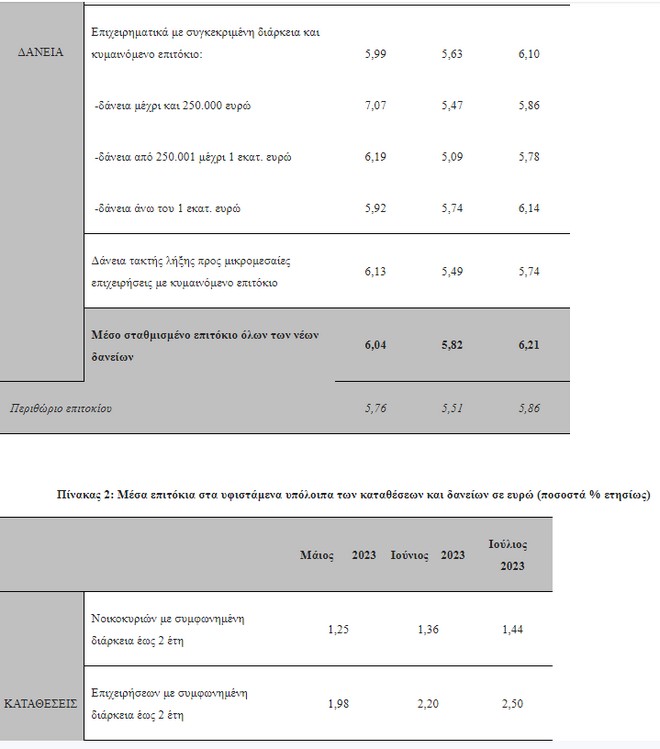 Το μέσο επιτόκιο των νέων επιχειρηματικών δανείων με συγκεκριμένη διάρκεια και κυμαινόμενο επιτόκιο αυξήθηκε κατά 47 μονάδες βάσης, τον Ιούλιο του 2023, και διαμορφώθηκε στο 6,10%. Το μέσο επιτόκιο των δανείων τακτής λήξης με κυμαινόμενο επιτόκιο προς μικρομεσαίες επιχειρήσεις (ΜΜΕ) αυξήθηκε κατά 25 μονάδες βάσης και διαμορφώθηκε στο 5,74%.