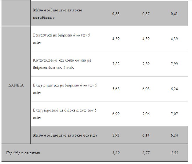 Το μέσο επιτόκιο των καταναλωτικών δανείων με συγκεκριμένη διάρκεια και κυμαινόμενο επιτόκιο αυξήθηκε κατά 43 μονάδες βάσης και διαμορφώθηκε στο 13,01%. Το μέσο επιτόκιο των στεγαστικών δανείων με κυμαινόμενο επιτόκιο αυξήθηκε κατά 16 μονάδες βάσης και διαμορφώθηκε στο 4,19%.