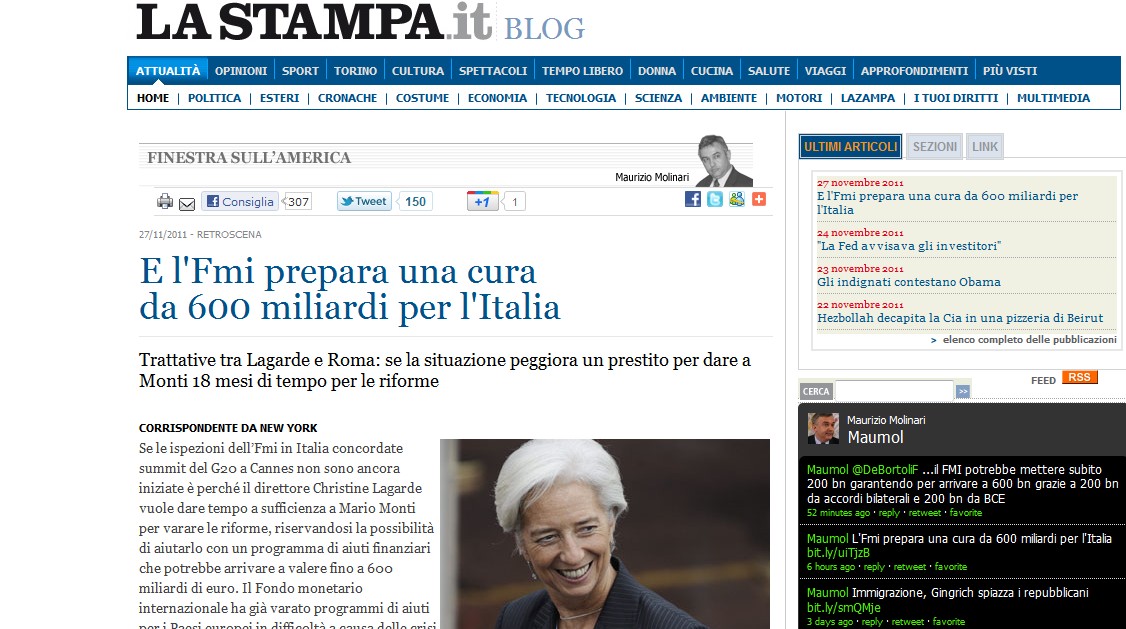 Η Λα Στάμπα, προσθέτει, ότι “υπήρξε τουλάχιστον μία τηλεφωνική συνομιλία του νέου Ιταλού πρωθυπουργού, Μάριο Μόντι, με την επικεφαλής του Διεθνούς Νομισματικού Ταμείου, Κριστίν Λαγκάρντ, υπό το φως των συνεχώς εξελίξεων, που καθιστούν παρωχημένες τις αποφάσεις της διάσκεψης G20 των Καννών”.