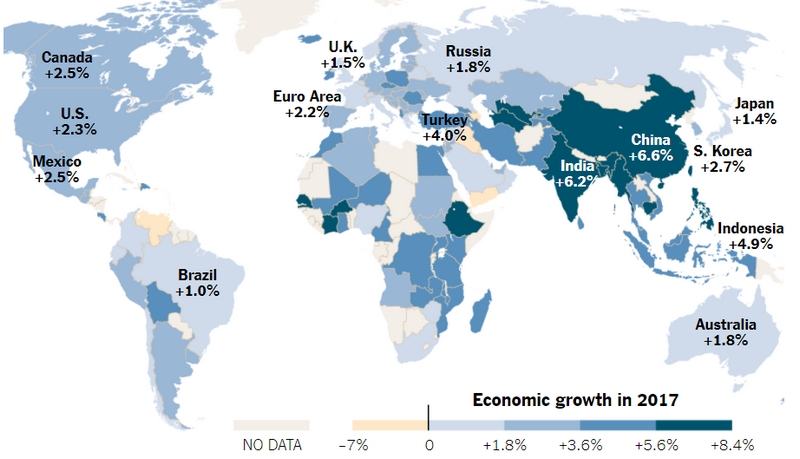 Το άρθρο παραθέτει χάρτη στον οποίο φαίνονται οι χώρες που παρουσιάζουν ανάπτυξη και για πρώτη φορά βλέπουμε την υφήλιο βαμμένη στα μπλε. Ωστόσο, η κατάσταση απέχει ακόμη πολύ από το να χαρακτηριστεί σταθερή, ενώ και οι πολιτικές αναταράξεις ανησυχούν τις αγορές. Πριν την μεγάλη κρίση του 2008, σημειώνεται στο άρθρο, η παγκόσμια οικονομία έτρεχε με ρυθμούς που ξεπερνούν “καθαρά” το 4%, ενώ για το 2018 η πρόβλεψη θέλει τον ίδιο δείκτη να αγγίζει ασθμαίνοντας το 3.9%.
