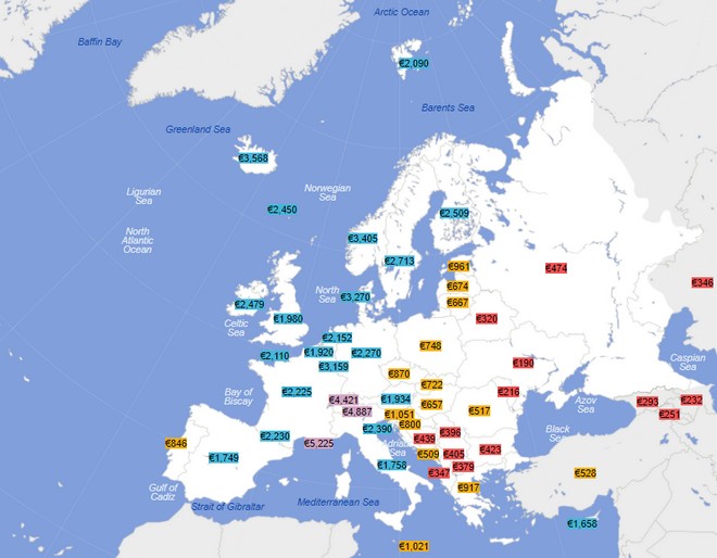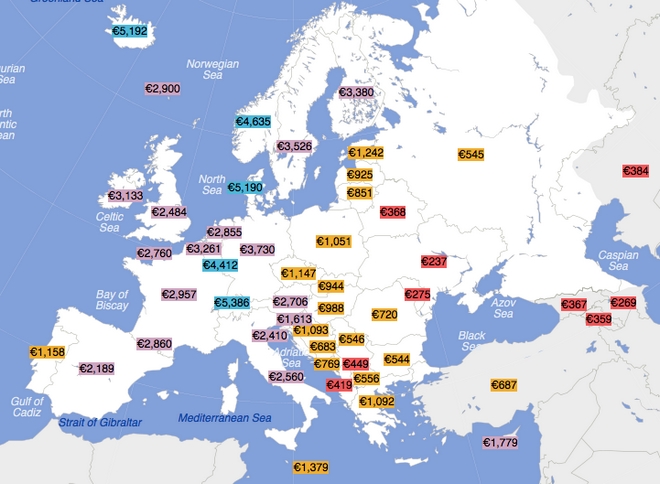 Χάρτης: Οι μέσοι μισθοί στην Ευρώπη. Που είναι 4.420 ευρώ και που 190 ευρώ