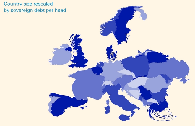 Η Deutsche Bank δημοσίευσε μόλις έναν χάρτη που παρουσιάζει το πώς θα έμοιαζαν τα σύνορα των ευρωπαϊκών κρατών με βάση το εθνικό τους χρέος ανά άτομο.
