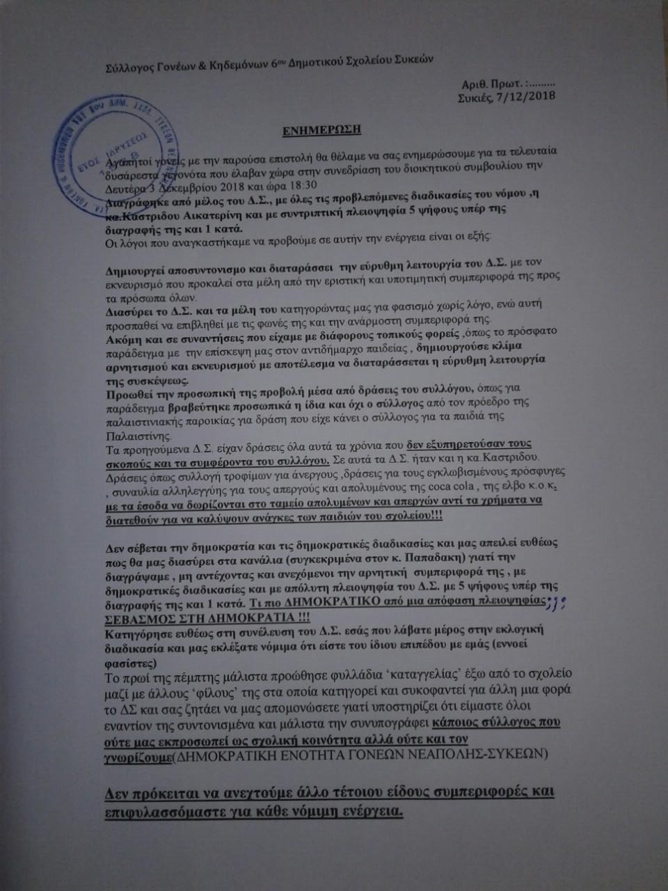 Αλγεινή εντύπωση προκαλεί η καταγγελία, περί διαγραφής μέλους του Διοικητικού Συμβουλίου του συλλόγου γονέων και κηδεμόνων του 6ου δημοτικού σχολείου Συκεών για πολιτικούς λόγους, καθώς είχε πρωτοστατήσει σε δράσεις αλληλεγγύης του Συλλόγου.