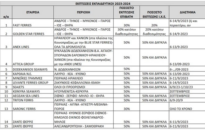 Ανακοινώνονται εκπτώσεις έως και 50% στα ακτοπλοϊκά των αναπληρωτών εκπαιδευτικών. Η έκπτωση θα αφορά στην κάλυψη των μετακινήσεων των εκπαιδευτικών από τους μόνιμους τόπους κατοικίας τους προς το τελικό νησί, στο οποίο ανέλαβαν υπηρεσία. Πιο συγκεκριμένα, οι εκπτώσεις ανά εταιρεία διαμορφώνονται ως ακολούθως: