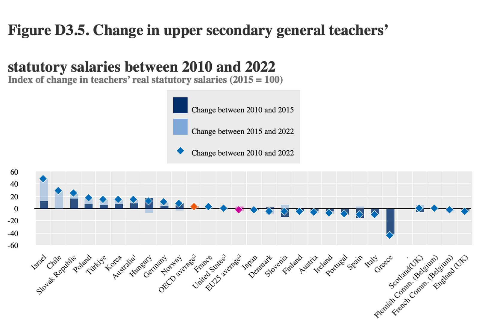 Ποιοι είναι όμως αυτοί που κάνουν ιδιαίτερα; Σύμφωνα με έρευνα [2], οι περισσότεροι είναι εν ενεργεία καθηγητές σε δημόσια σχολεία, έχοντας τη δυνατότητα να αντλούν “πελάτες” από τους μαθητές των σχολείων τους. Το καίριο ερώτημα, όμως, είναι γιατί κάνουν ιδιαίτερα; Η απάντηση, προφανώς, είναι γνωστή: οι εκπαιδευτικοί στη χώρα μας υποαμείβονται, αφού βρίσκονται στις πιο χαμηλές θέσεις στην Ευρώπη. Ειδικότερα, σύμφωνα με τα πιο πρόσφατα στοιχεία του ΟΟΣΑ [3], οι μεγαλύτερες πραγματικές μειώσεις στους μισθούς μεταξύ 2010 και 2022 σημειώθηκαν στην Ελλάδα, όπου οι μισθοί μειώθηκαν κατά περισσότερο από 30% στην προσχολική, πρωτοβάθμια και δευτεροβάθμια εκπαίδευση.