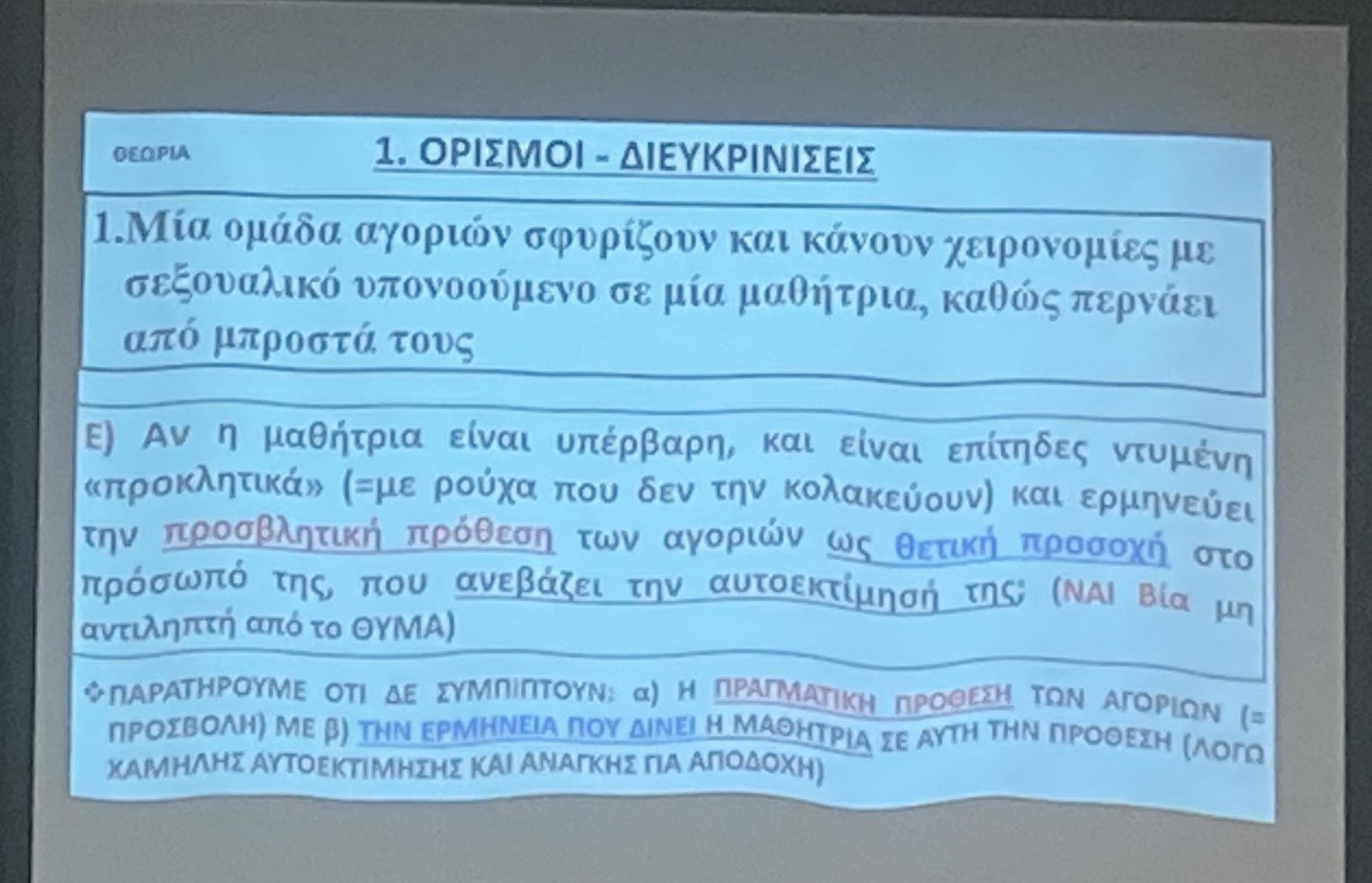 Προ λίγων εβδομάδων πραγματοποιήθηκαν επιμορφωτικές συναντήσεις για δεκάδες εκπαιδευτικούς μεγάλων τάξεων του δημοτικού και για διευθυντές/διευθύντριες, σε περιοχή του κέντρου της Αθήνας. Θέμα: Σχολικός Εκφοβισμός – Bullying. Μέρος του περιεχομένου ωστόσο της επιμόρφωσης και όσα ακούστηκαν στην αίθουσα παρέπεμπαν σε άλλες εποχές, ήταν μηνύματα υποδόριου σεξισμού.