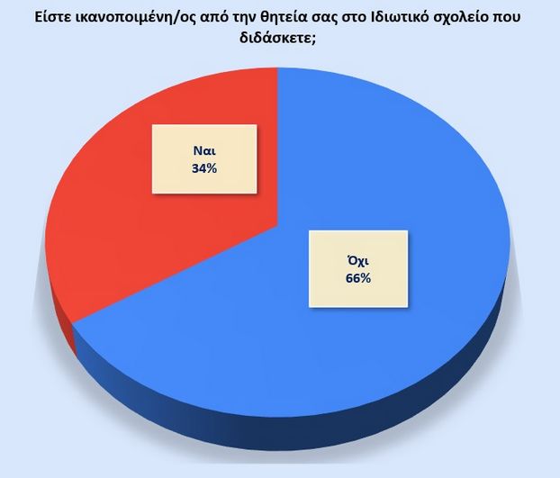 - Ο βαθμός επαγγελματικής ικανοποίησης των ιδιωτικών εκπαιδευτικών είναι σχετικά χαμηλός. Από τα ευρήματα της έρευνας προκύπτει ότι οι περισσότεροι δεν είναι ικανοποιημένοι από το περιβάλλον εργασίας τους (σε ποσοστό 55%) και θα αναζητούσαν διέξοδο ως Αναπληρωτές στην Δημόσια Εκπαίδευση σε ποσοστό 58%.