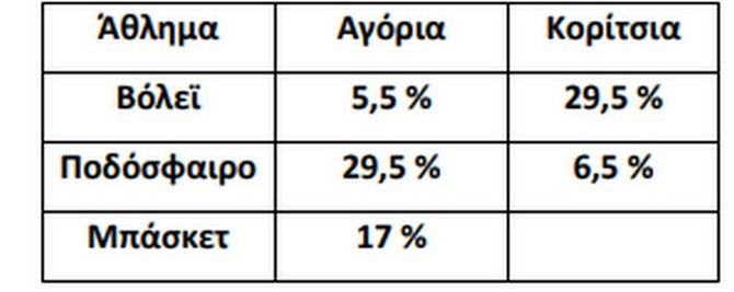 Το ζήτημα 25 ήταν το ακόλουθο: Σε μια κατασκήνωση κάθε παιδί έχει επιλέξει να κάνει ακριβώς ένα άθλημα. Στον πίνακα που ακολουθεί φαίνονται τα ποσοστά των παιδιών για διάφορους συνδυασμούς φύλου και αθλήματος. Για παράδειγμα, το 17% των παιδιών είναι αγόρια που έχουν επιλέξει μπάσκετ. Τι ποσοστό των κοριτσιών έχει επιλέξει μπάσκετ;