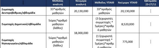 • Οι μαθητές πρωτοβάθμιας είναι 720.000, και δεν κάνουν 25 ώρες την εβδομάδα. Κάνουν 3.10 ώρες οι μαθητές δημοτικού (5 μισάωρα) και 2.10 ώρες οι μαθητές νηπιαγωγείου. Στο νηπιαγωγείο και το δημοτικό οι μαθητές μπαίνουν μία φορά στο μάθημα (δεν έχουν διαφορετικό καθηγητή ανά μάθημα), επομένως δεν είναι σωστός ο υπολογισμός [αριθμός μαθητών]*25ώρες την εβδομάδα. Προσεγγιστικά όμως μπορούμε να θεωρήσουμε ότι οι μαθητές δημοτικού μπαίνουν σε διαφορετική τάξη 3 φορές την ημέρα (λόγω κάποιον εκπαιδευτικών ειδικοτήτων), ενώ οι μαθητές νηπιαγωγείου μπαίνουν μόνο μία φορά την ημέρα (ένας μόνο νηπιαγωγός):