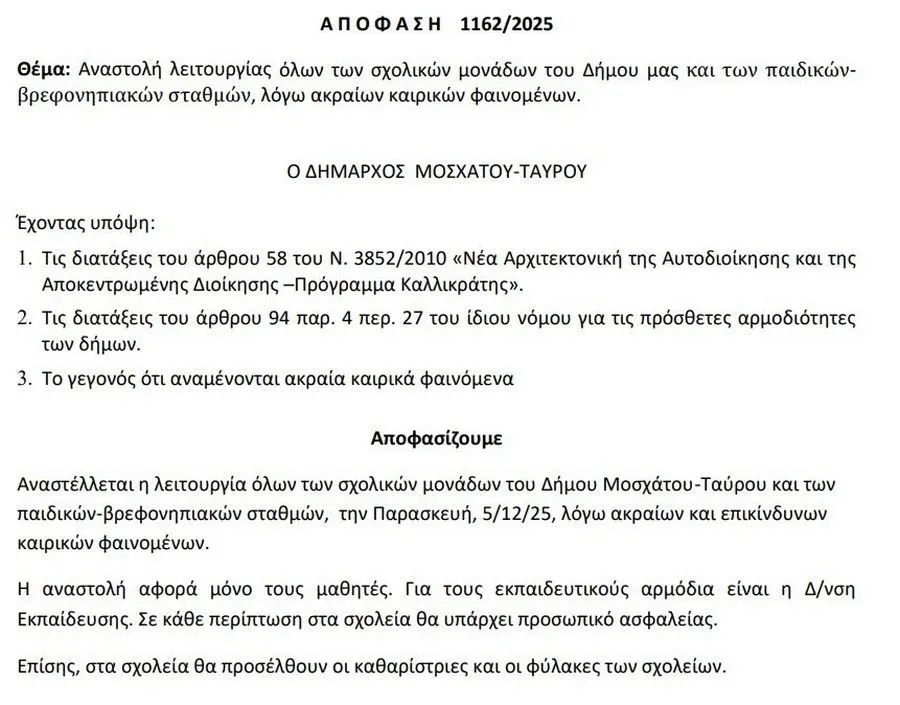 Η ανακοίνωση του Δήμου Μοσχάτου – Ταύρου, που φέρει την υπογραφή του Δήμαρχου Ανδρέα Ευθυμίου, αναφέρει: «Αναστέλλεται η λειτουργία όλων των σχολικών μονάδων του Δήμου Μοσχάτου-Ταύρου και των παιδικών-βρεφονηπιακών σταθμών, την Παρασκευή, 5/12/25, λόγω ακραίων και επικίνδυνων καιρικών φαινομένων. Η αναστολή αφορά μόνο τους μαθητές. Για τους εκπαιδευτικούς αρμόδια είναι η Δ/νση Εκπαίδευσης.