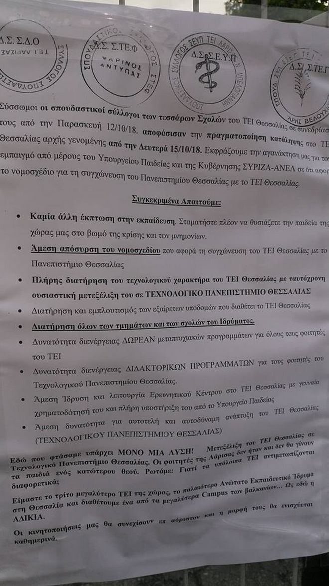 Κατάληψη στο ΤΕΙ Θεσσαλίας: Οι σπουδαστές διαμαρτύρονται για τη συγχώνευση με το ΑΕΙ