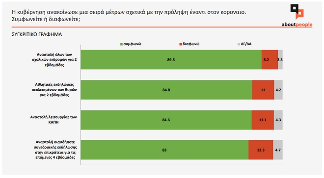 Την ίδια ώρα, στην έρευνα που πραγματοποίησε η aboutpeople σχετικά με τον κορονοϊό, καταγράφεται αφενός η σχετική ικανοποίηση του κοινού με τους ευρύτερους χειρισμούς ως τώρα, ωστόσο το στοιχείο που έχει ενδιαφέρον είναι πως συντριπτική πλειοψηφία συμφωνεί με τα κύρια μέτρα που ανακοίνωσε η κυβέρνηση, επικροτώντας τα.