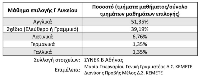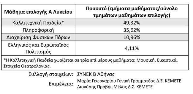Η ομάδα των ΣΥΝΕΚ της Β Αθήνας σε συνεργασία με τα μέλη του Δ.Σ. του ΚΕΜΕΤΕ της ΟΛΜΕ Μαρία Γεωργαρίου (Γενική Γραμματέας) και Διονύση Προβή, συνέλεξαν και επεξεργάστηκαν στοιχεία από τα μισά περίπου Ημερήσια Γενικά Λύκεια της περιοχής για τα μαθήματα επιλογής που διδάχθηκαν το σχολικό έτος 2020-2021. Τα αποτελέσματα είναι τα εξής: