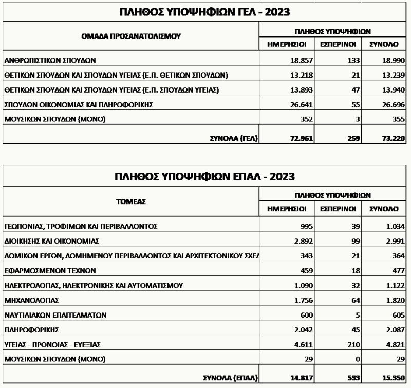 Τα στατιστικά στοιχεία των βαθμολογικών επιδόσεων των υποψηφίων στις Πανελλαδικές Εξετάσεις 2023.