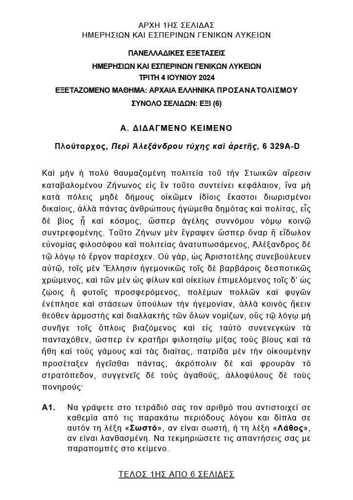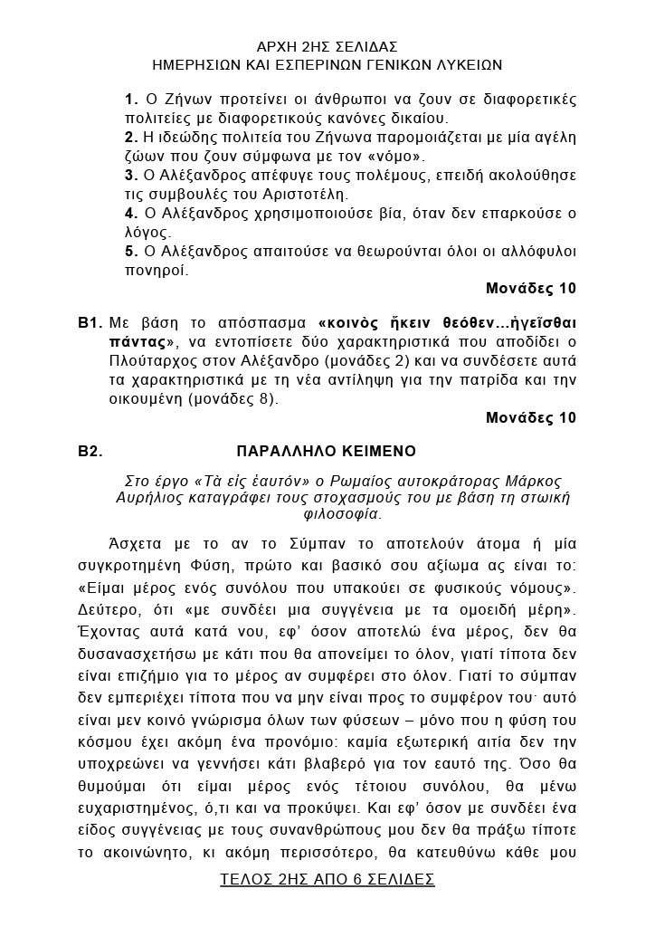 Στο γνωστό κείμενο οι μαθητές κλήθηκαν να απαντήσουν για την Πολιτεία που “οραματιζόταν” ο Αλέξανδρος, ενώ εκτενής αναφορά γίνεται στον Ζήνωνα.