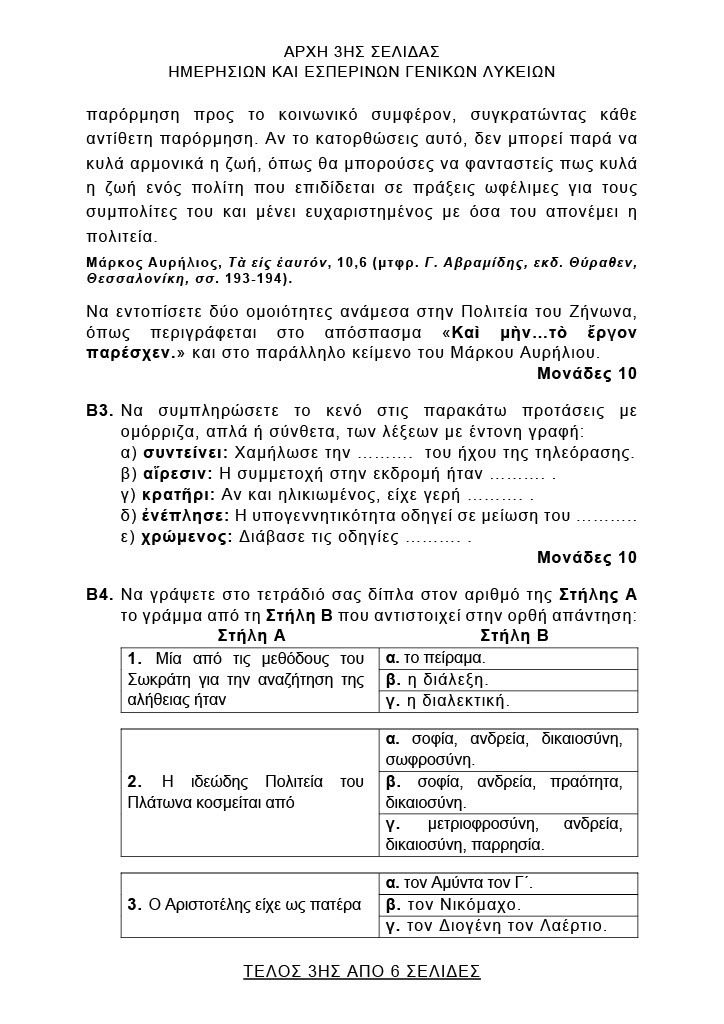 Β2. Παράλληλο κείμενο (Μάρκος Αυρήλιος, Τά εἰς ἑαυτόν , 10,6 (Μτφρ. Γ. Αβραμίδης, εκδ. Θύραθεν, Θεσσαλονίκη, σ.σ. 193- 194). Απαιτεί συνδυαστική και κριτική σκέψη