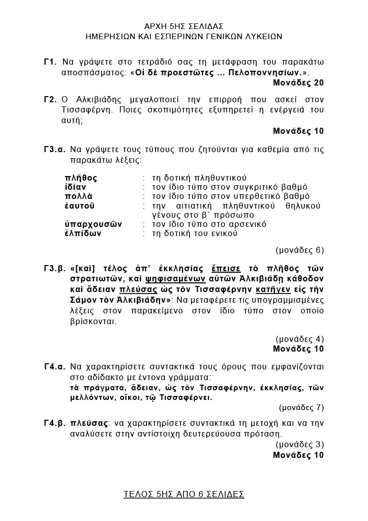 Στο μάθημα των αρχαίων ελληνικών οι μαθητές εξετάστηκαν στο απόσπασμα “Πλούταρχος, Περί Αλεξάνδρου τύχης και αρετής 6 329 Α-D” και στο αδίδακτο σε κείμενο του Θουκυδίδη (( Θουκυδίδη Ιστορίαι, Θ 81. 1-2 ).
