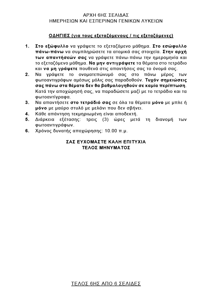 Στο μάθημα των αρχαίων ελληνικών εξετάστηκαν οι μαθητές στο απόσπασμα “Πλούταρχος, Περί Αλεξάνδρου τύχης και αρετής 6 329 Α-D” και στο αδίδακτο σε κείμενο του Θουκυδίδη.