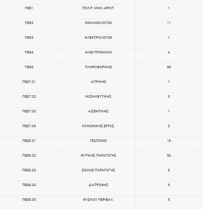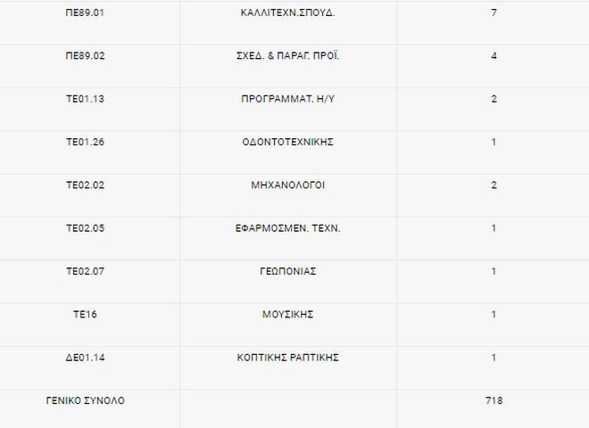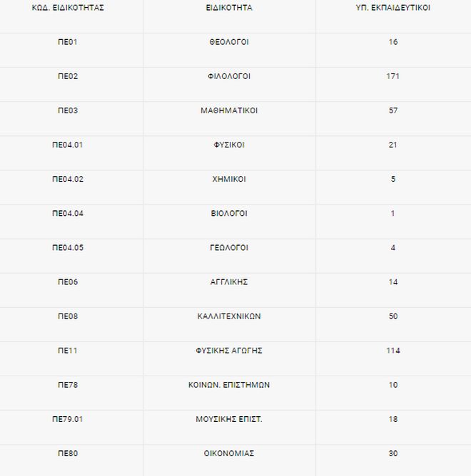 Ο συνολικός αριθμός οργανικά τοποθετημένων εκπαιδευτικών Δευτεροβάθμιας Εκπαίδευσης στις Σχολικές Μονάδες Ειδικής Αγωγής & Εκπαίδευσης (ΣΜΕΑΕ) ανέρχεται στους 718 εκπαιδευτικούς (692 αντίστοιχα στην Α/θμια), οι ειδικότητες των οποίων αναγράφονται στον παρακάτω πίνακα, σύμφωνα με τα καταχωρισμένα στοιχεία στο myschool.