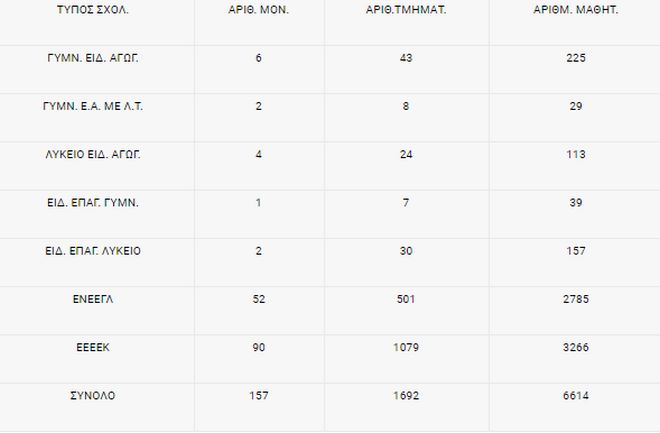 Με βάση τα στοιχεία του myschool Ο συνολικός αριθμός τμημάτων που λειτουργούν στις ΣΜΕΑΕ της Πρωτοβάθμιας Εκπαίδευσης είναι 1.202 και ο συνολικός αριθμός μαθητών που φοιτούν σε αυτά 4.754. Αντίστοιχα ο συνολικός αριθμός τμημάτων που λειτουργούν στις ΣΜΕΑΕ της Δευτεροβάθμιας Εκπαίδευσης είναι 1.692 και ο συνολικός αριθμός μαθητών που φοιτούν σε αυτά είναι 6.614. Πιο αναλυτικά: