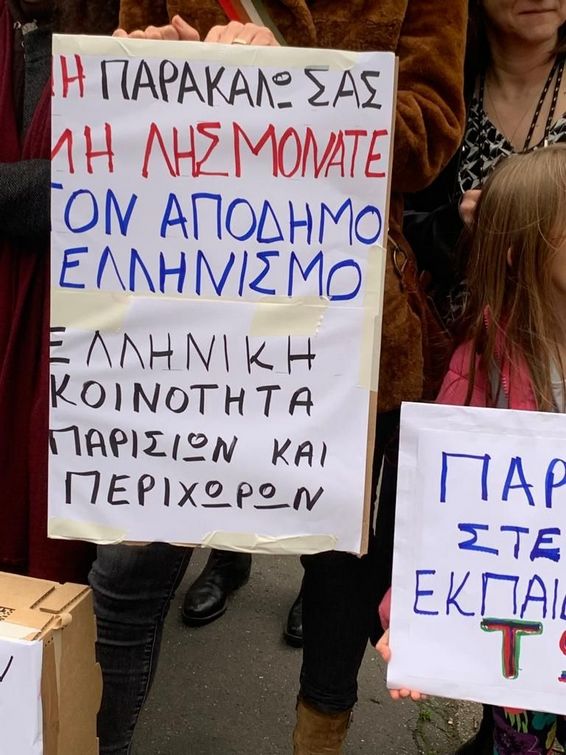 Σε σημείο που βρίσκεται πολύ κοντά στην ελληνική πρεσβεία Ελληνες όλων των ηλικιών (και μαθητές) συγκεντρώθηκαν κρατώντας πανό και φωνάζοντας συνθήματα για την ουσιαστική ενίσχυση της ελληνικής εκπαίδευσης στο Παρίσι, στη Γαλλία και γενικότερα στην Ευρώπη.