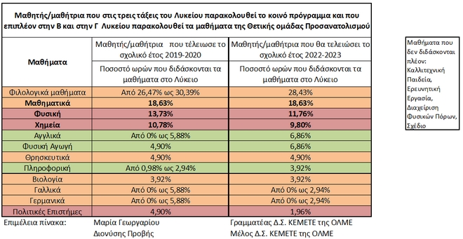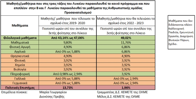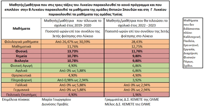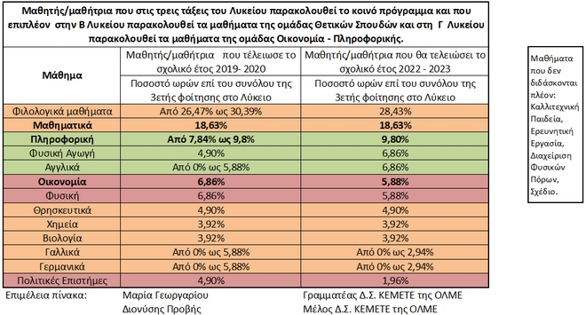 Σε ρεπορτάζ την 21η Ιουνίου με την πολύτιμη αρωγή του ΚΕΜΕΤΕ (Κέντρο Εκπαιδευτικών Μελετών και Τεκμηρίωσης της ΟΛΜΕ) είχαμε παρουσιάσει τι ακριβώς αλλάζει στις εβδομαδιαίες ώρες των καθηγητών ανά μάθημα. Πλέον ήρθε η ώρα, πάντα με τη βοήθεια του ΚΕΜΕΤΕ, να προσεγγίσουμε το θέμα από την πλευρά των μαθητών με παραδείγματα έτσι ώστε να διαπιστωθεί ποια θα είναι η διαφορά στο πρόγραμμα ενός μαθητή που θα τελειώνει το Λύκειο τη σεζόν 2022-2023 σε σχέση μ’ έναν μαθητή που τελείωσε εφέτος.