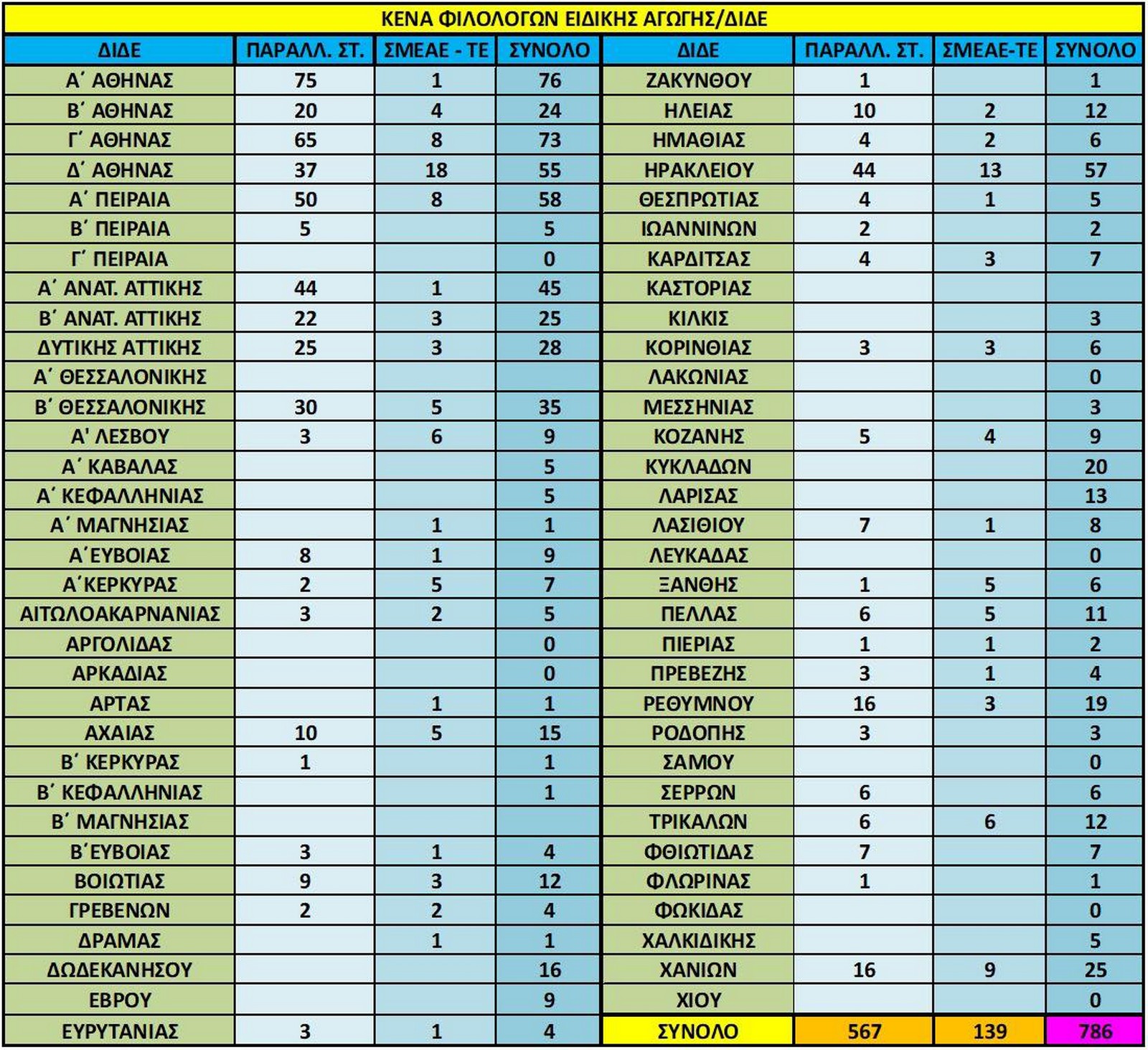 Τα κενά, λοιπόν, μόνο των φιλολόγων της ειδικής αγωγής ανέρχονται σε 786 σ’ όλη την Ελλάδα, οι 567 από αυτούς στην παράλληλη στήριξη.