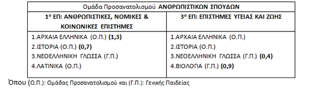 Ειδικότερα, οι εναλλακτικοί συνδυασμοί πανελλαδικώς εξεταζομένων μαθημάτων της Ομάδας Προσανατολισμού Ανθρωπιστικών Σπουδών ανά Επιστημονικό Πεδίο και οι συντελεστές βαρύτητας των δύο μαθημάτων παρουσιάζονται στον παρακάτω πίνακα: